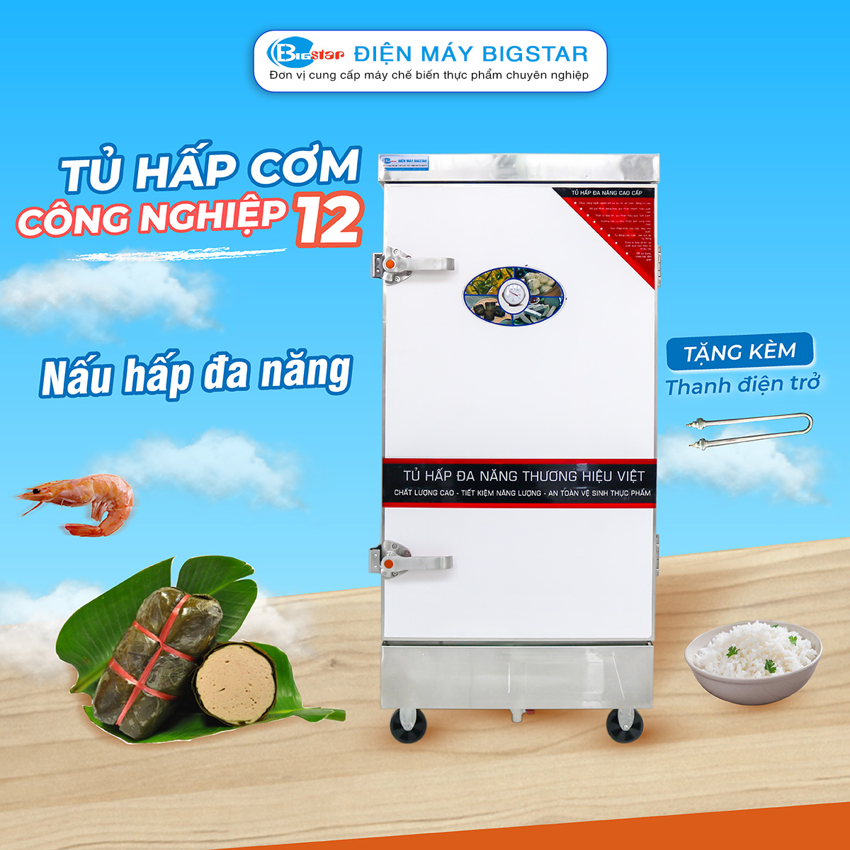 Thiết kế sang trọng, năng suất một mẻ nấu cung cấp cho trên 180 suất cơm, giá thành rẻ là 3 ưu điểm nổi bật khi nhắc đến TC-NK12D dòng tủ nấu cơm công nghiệp 12 khay dùng điện.